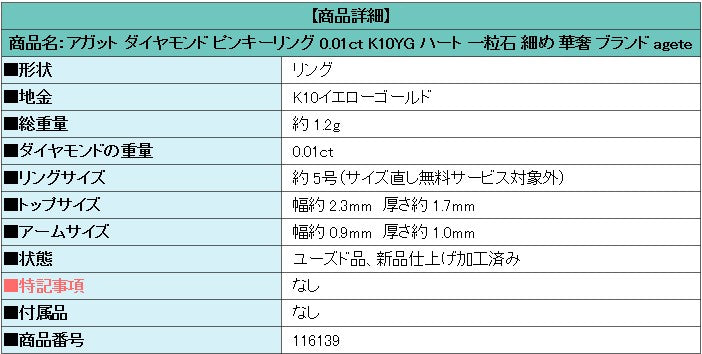 商品名:アガット ダイヤモンド ピンキーリング 0.01ct K10YG ハート 一粒石 細め 華奢 ブランド agete