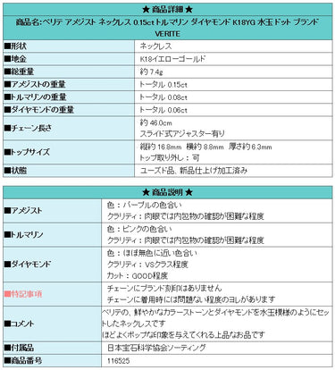 商品名:ベリテ アメジスト ネックレス 0.15ct トルマリン ダイヤモンド K18YG 水玉 ドット ブランド VERITE