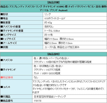 商品名:アスプレンディ アメジスト リング ダイヤモンド K18WG 蝶 チョウ バタフライ パピヨン 昆虫 動物 アニマル ブランド Asplendi