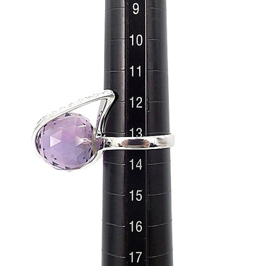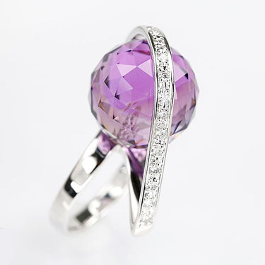 コメント 水野薫子の、ミラーボールのようにカットされたアメジストが目を引く、個性的なリングです。ゆったりと空間を使ったダイヤモンドのラインが、優美な雰囲気を感じさせる大人な一品です。