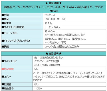 商品名:アーカー ダイヤモンド スターリーエトワール ネックレス 0.06ct K18YG 星 スター ブランド AHKAH