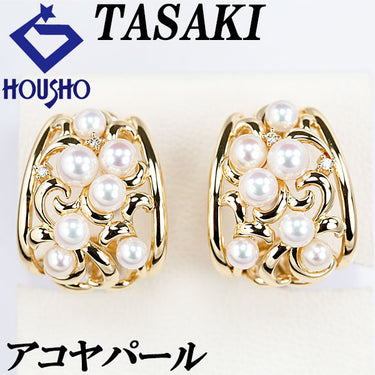 タサキ 田崎真珠 アコヤ真珠 イヤリング ダイヤモンド K18イエローゴールド TASAKI 透かし アールヌーヴォー 植物 ボタニカル【中古】【904355】
