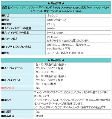 商品名:ウィッシュアポンアスター ダイヤモンド ネックレス 0.093ct K18PG 変形カット ファンシーカット スターカット 華奢 ブランド WISH UPON A STAR