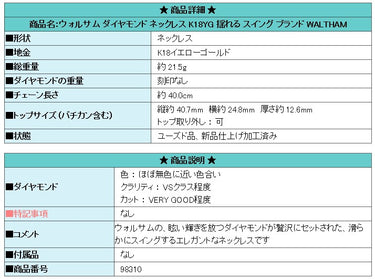 商品名:ウォルサム ダイヤモンド ネックレス K18YG 揺れる スイング ブランド WALTHAM