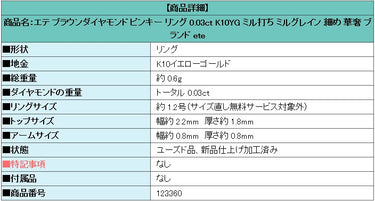 商品名:エテ ブラウンダイヤモンド ピンキー リング 0.03ct K10YG ミル打ち ミルグレイン 細め 華奢 ブランド ete