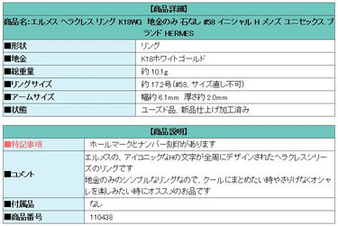 商品名:エルメス ヘラクレス リング K18WG 地金のみ 石なし #58 イニシャル H メンズ ユニセックス ブランド HERMES