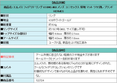 商品名:エルメス フィデリテ リング K18WG #60 メンズ ユニセックス 梨地 マット ツヤ消し ブランド HERMES