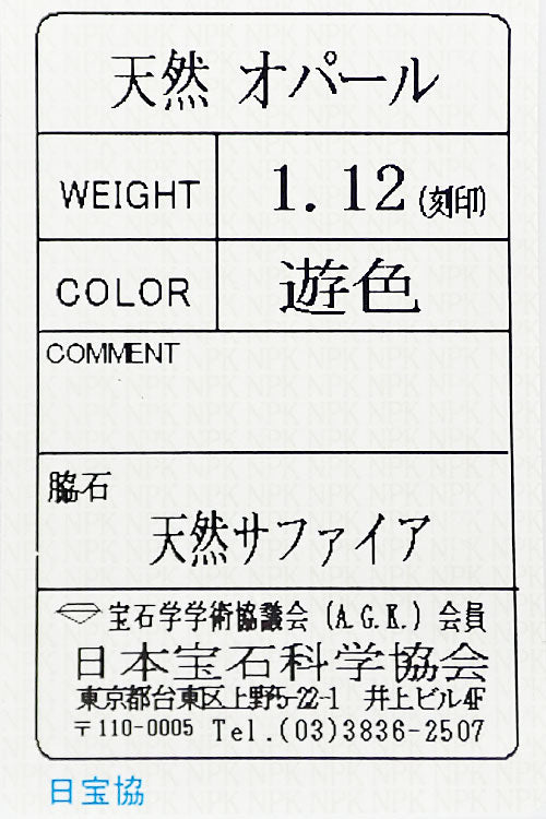 オパール 色:半透明の乳白色の地色にオレンジ・イエロー・グリーン・ブルーの斑のある遊色