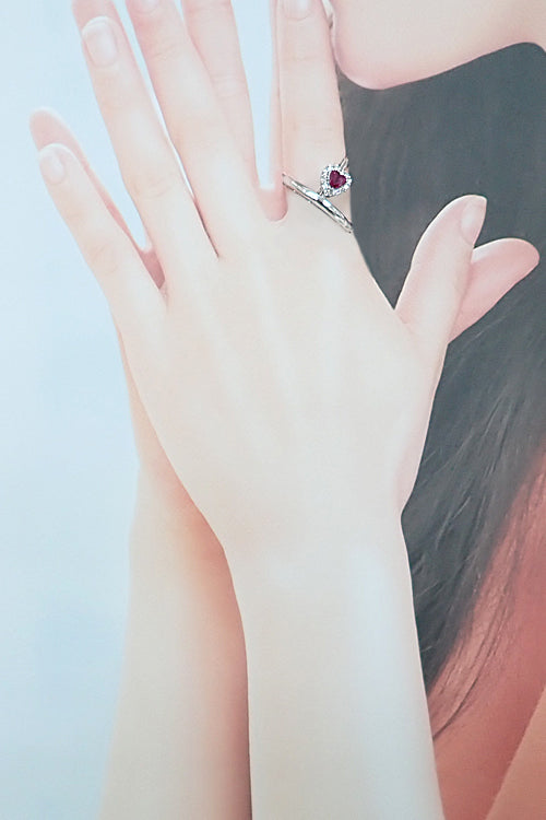 コメント カラッチの、艶やかな色合いのハートシェイプのルビーが上品なリングです。ユニークなデザインなので、甘くなりすぎずカジュアルにもお召しいただけます。