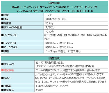 商品名:レ・エッセンシャル サファイア リング K18WG ハート ミステリーセッティング プリンセスカット 変形カット ファンシーカット ブランド LES ESSENTIELLES