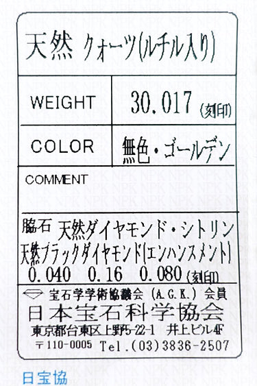 クラリティ :ゴールデンカラーの針状の鉱物(ルチル)を確認できる