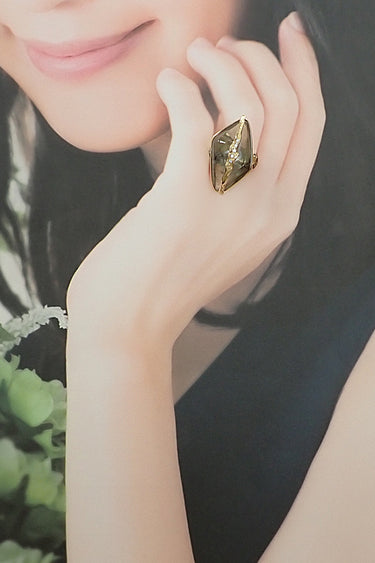 コメント 大きなルチルクォーツが大胆にセットされた、個性的でエレガントなリングです。クォーツの中には針状の鉱物であるルチルが唯一無二の世界を描いており、自然の美しさを一心に感じるお品です。