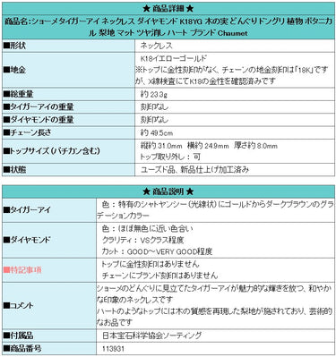 商品名:ショーメ タイガーアイ ネックレス ダイヤモンド K18YG 木の実 どんぐり ドングリ 植物 ボタニカル 梨地 マット ツヤ消し ハートブランド Chaumet
