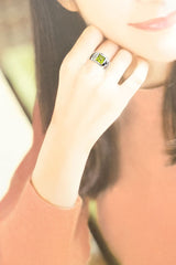 ショーメの、スクエアカットのペリドットが彩りを添える、モードな雰囲気のリングです