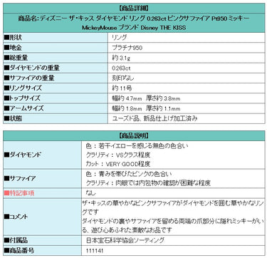 商品名:ディズニー ザ・キッス ダイヤモンド リング 0.263ct ピンクサファイア Pt950 ミッキー MickeyMouse ブランド Disney THE KISS