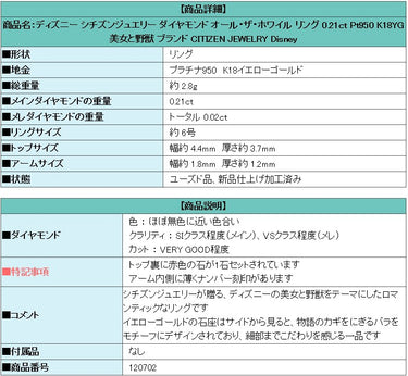 商品名:ディズニー シチズンジュエリー ダイヤモンド オール・ザ・ホワイル リング 0.21ct Pt950 K18YG 美女と野獣 ブランド CITIZEN JEWELRY Disney