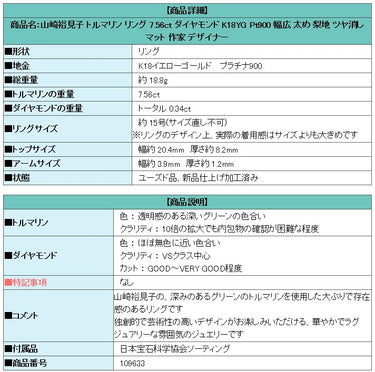 商品名:山崎裕見子 トルマリン リング 7.56ct ダイヤモンド K18YG Pt900 幅広 太め 梨地 ツヤ消し マット 作家 デザイナー