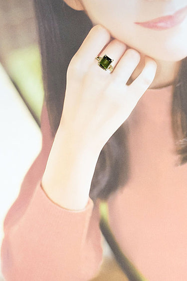 三越の、落ち着いたグリーンカラーのトルマリンが魅力的なクラシカルなリングです