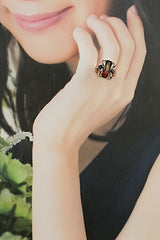 池田智治の、ちょっぴりダークな色味のバイカラートルマリンに、アレキサンドライトのようにカラーチェンジするガーネットを添えたリングです