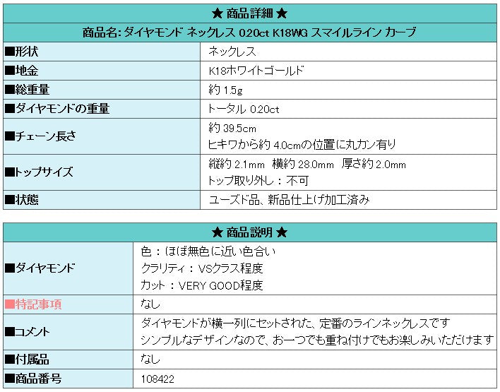 商品名:ダイヤモンド ネックレス 0.20ct K18WG スマイルライン カーブ