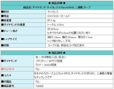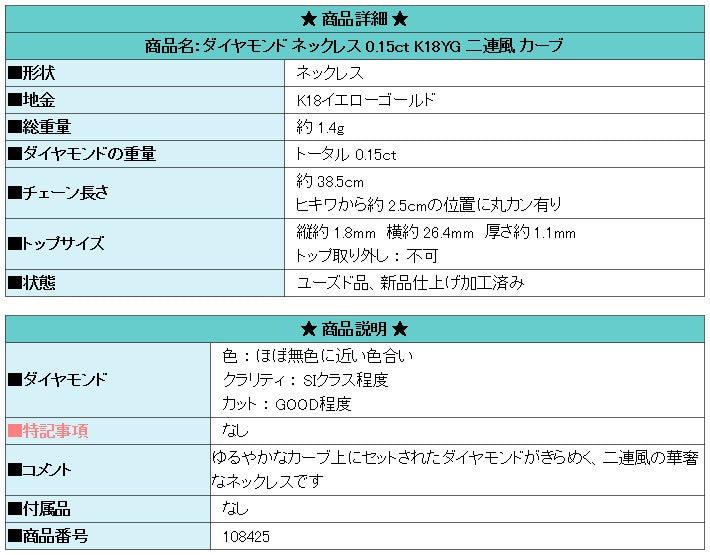 商品名:ダイヤモンド ネックレス 0.15ct K18YG 二連風 カーブ