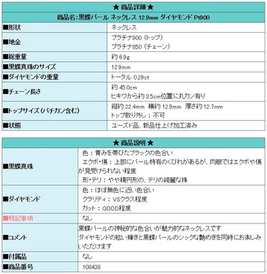 商品名:黒蝶パール ネックレス 12.9mm ダイヤモンド Pt900