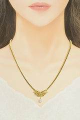 ミキモトの、翼のようなモチーフにダイヤモンドとアコヤパールが使用されたエレガントなネックレスです