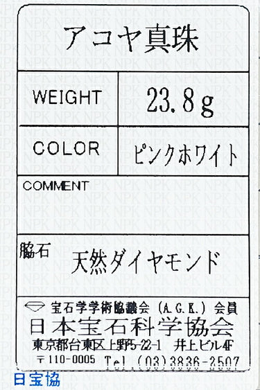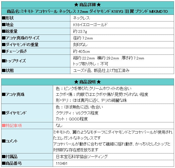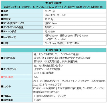 商品名:ミキモト アコヤパール ネックレス 7.2mm ダイヤモンド K18YG 羽 翼 ブランド MIKIMOTO