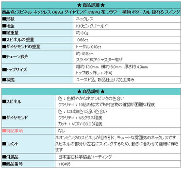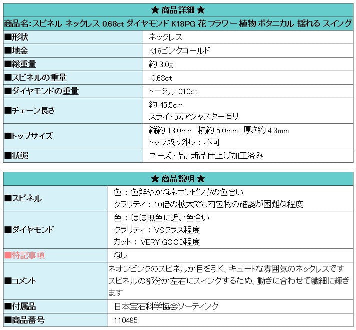 商品名:スピネル ネックレス 0.68ct ダイヤモンド K18PG 花 フラワー 植物 ボタニカル 揺れる スイング