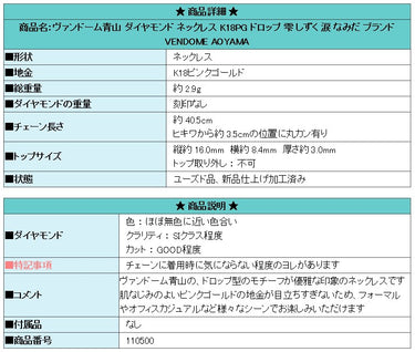 商品名:ヴァンドーム青山 ダイヤモンド ネックレス K18PG ドロップ 雫 しずく 涙 なみだ 一粒石 ブランド VENDOME AOYAMA