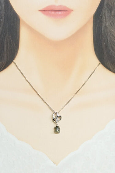 ミキモトの、くるりとした曲線で描いたハートモチーフに、黒蝶パールを垂らした、シックで品のあるネックレスです