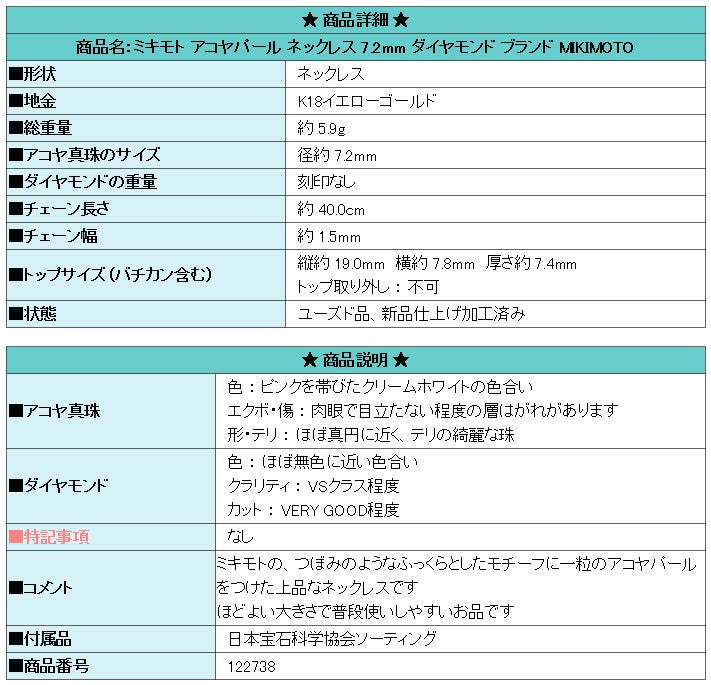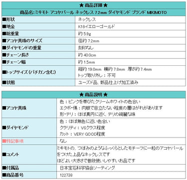 商品名:ミキモト アコヤパール ネックレス 7.2mm ダイヤモンド ブランド MIKIMOTO