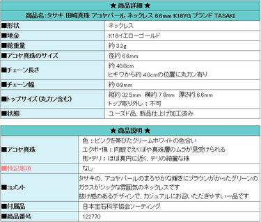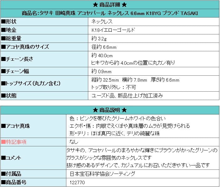 商品名:タサキ 田崎真珠 アコヤパール ネックレス 6.6mm K18YG ブランド TASAKI