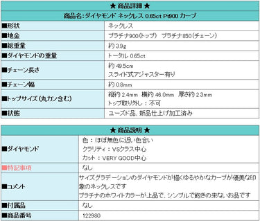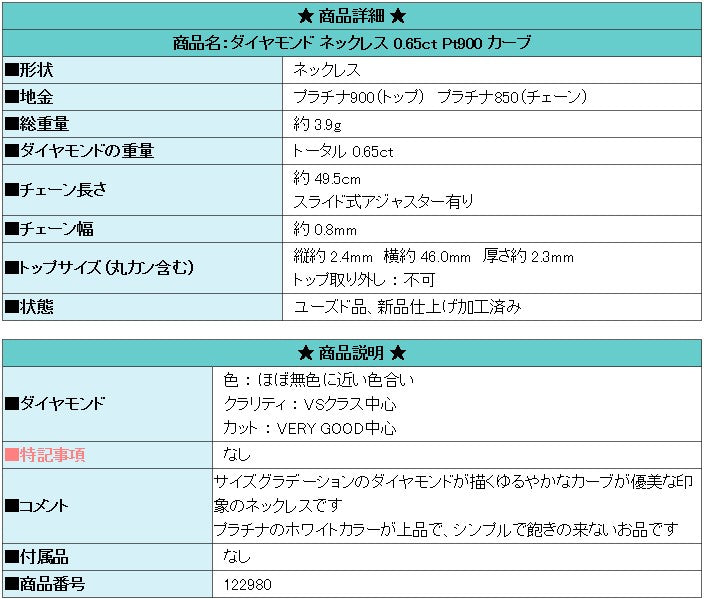 商品名:ダイヤモンド ネックレス 0.65ct Pt900 カーブ