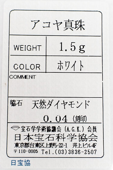 コメント アガットの、小ぶりなアコヤパールが上品に華やぐ、可憐な雰囲気のネックレスです。取り巻きには4粒のダイヤモンドがセットされており、チラチラとさり気ない煌めきを添えてくれます。