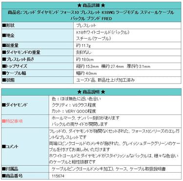 商品名:フレッド ダイヤモンド フォース10 ブレスレット K18WG ラージモデル スティールケーブル バックル ブランド FRED