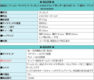 商品名:ブシュロン ダイヤモンド ネックレス K18YG ドロップ 雫 しずく 涙 なみだ ロープ 透かし ブランド BOUCHERON