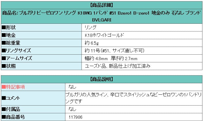商品名:ブルガリ ビーゼロワン リング K18WG 1バンド #51 Bzero1 B-zero1 地金のみ 石なし ブランド BVLGARI