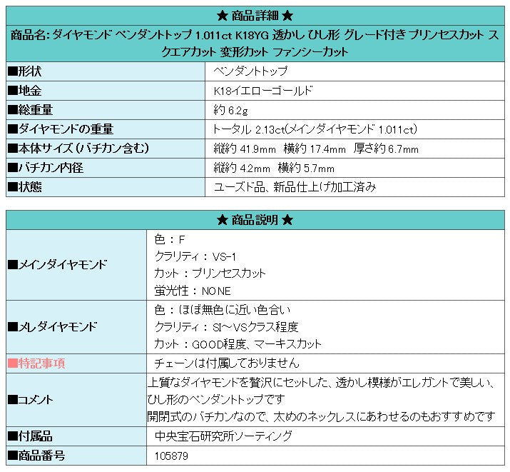 商品名:ダイヤモンド ペンダントトップ 1.011ct K18YG 透かし ひし形 グレード付き プリンセスカット スクエアカット 変形カット ファンシーカット
