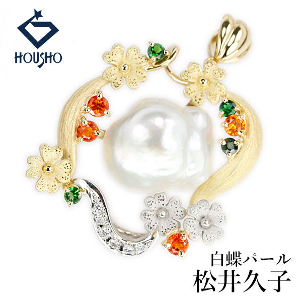 商品名 松井久子 白蝶真珠(南洋真珠) ペンダントトップ ダイヤモンド トルマリン ガーネット K18イエローゴールド Pt900 作家 デザイナー 花 フラワー 植物 ボタニカル 透かし 梨地 マット ツヤ消し