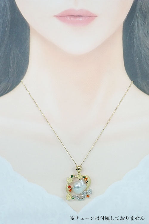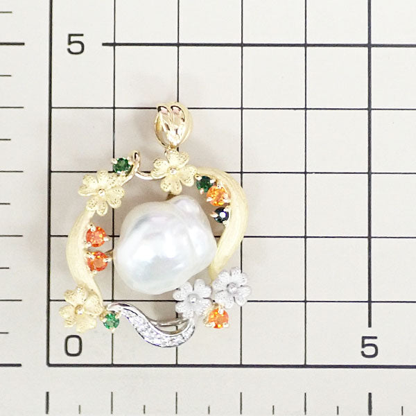 松井久子 白蝶真珠(南洋真珠) ペンダントトップ ダイヤモンド トルマリン ガーネット K18イエローゴールド Pt900 作家 デザイナー 花 フラワー 植物 ボタニカル 透かし 梨地 マット ツヤ消し【中古】【904210】