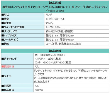 商品名:ポンテヴェキオ ダイヤモンド リング 0.21ct K18PG ハート 星 スター 月 透かし パヴェ ブランド PonteVecchio
