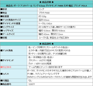 商品名:ポーラ アコヤパール リング 8.3mm ダイヤモンド Pt900 太め 幅広 ブランド POLA