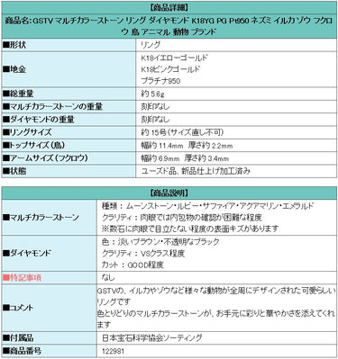 商品名:GSTV マルチカラーストーン リング ダイヤモンド K18YG PG Pt950 ネズミ イルカ ゾウ フクロウ 鳥 アニマル 動物 ブランド