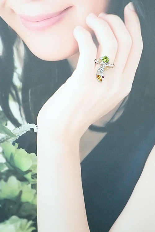 コメント 色とりどりのカラーストーンをセットした、アシンメトリーな配置がおしゃれなリングです。縦長のフォルムが指をすっきりと美しくみせてくれます。