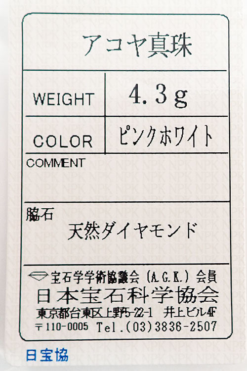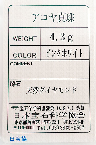 アコヤ真珠 色:ピンクを帯びたクリームホワイトの色合い