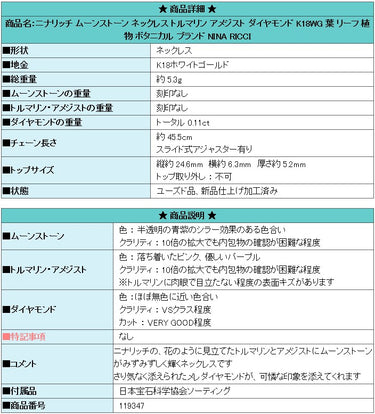 商品名:ニナリッチ ムーンストーン ネックレス トルマリン アメジスト ダイヤモンド K18WG 葉 リーフ 植物 ボタニカル ブランド NINARICCI