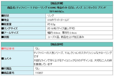 商品名:ティファニー T ナロー リング K18WG 地金のみ 石なし メンズ ユニセックス ブランド TIFFANY&Co.