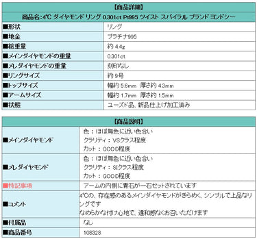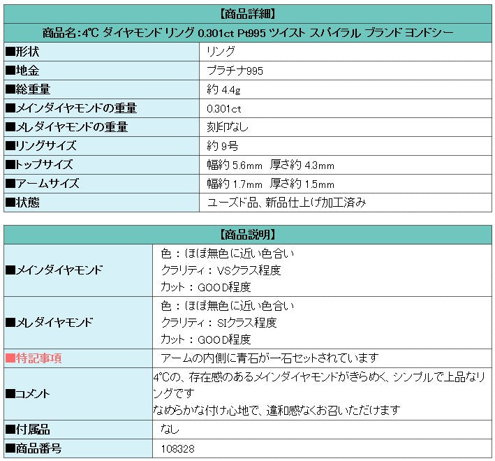 商品名:4℃ ダイヤモンド リング 0.301ct Pt995 ツイスト スパイラル ブランド ヨンドシー