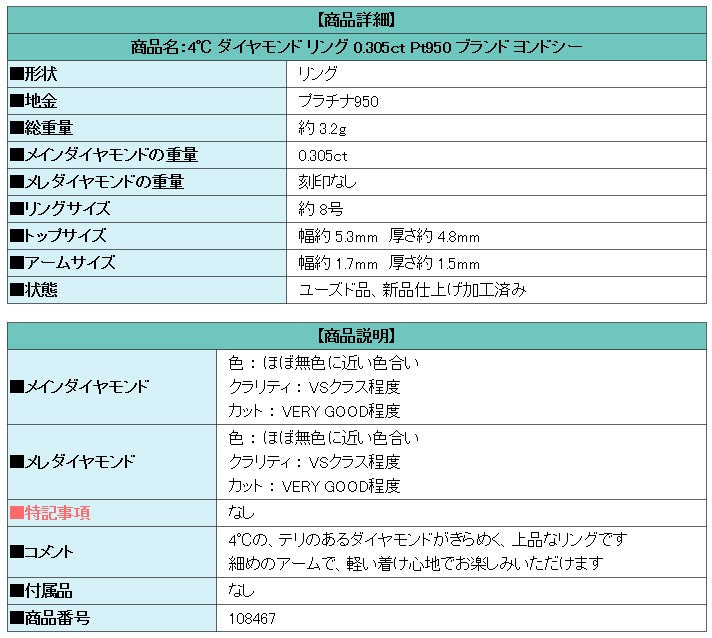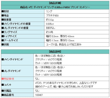 商品名:4℃ ダイヤモンド リング 0.305ct Pt950 ブランド ヨンドシー